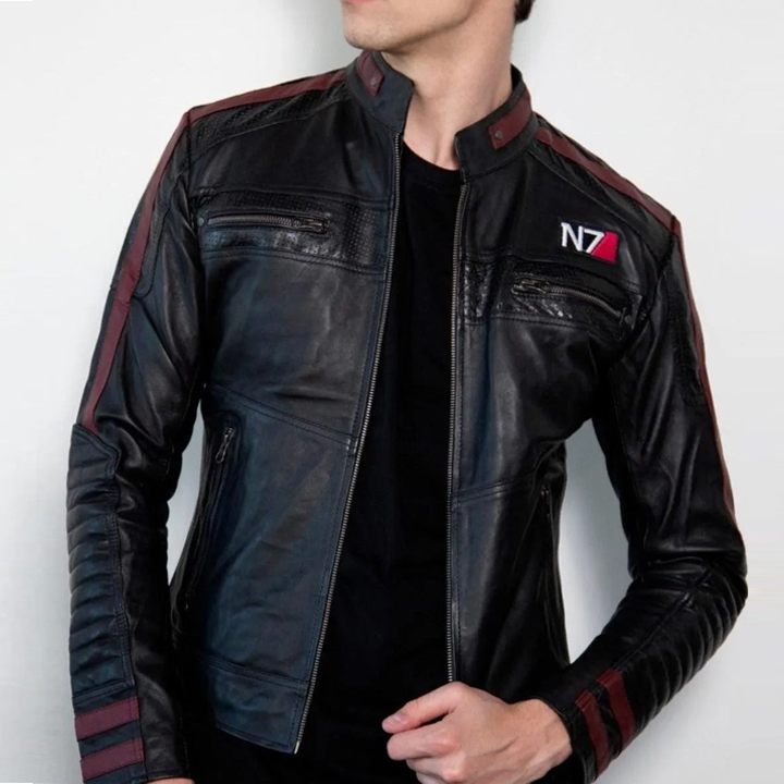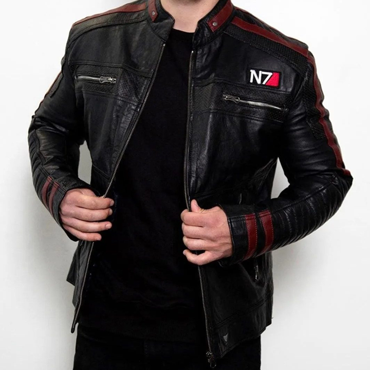 Upgrade your style with this Premium Black Leather Jacket, crafted for those who love a bold and timeless look. Made from high-quality genuine leather, this jacket features stylish red stripes and the iconic N7 patch, giving it a heroic and fashionable edge.